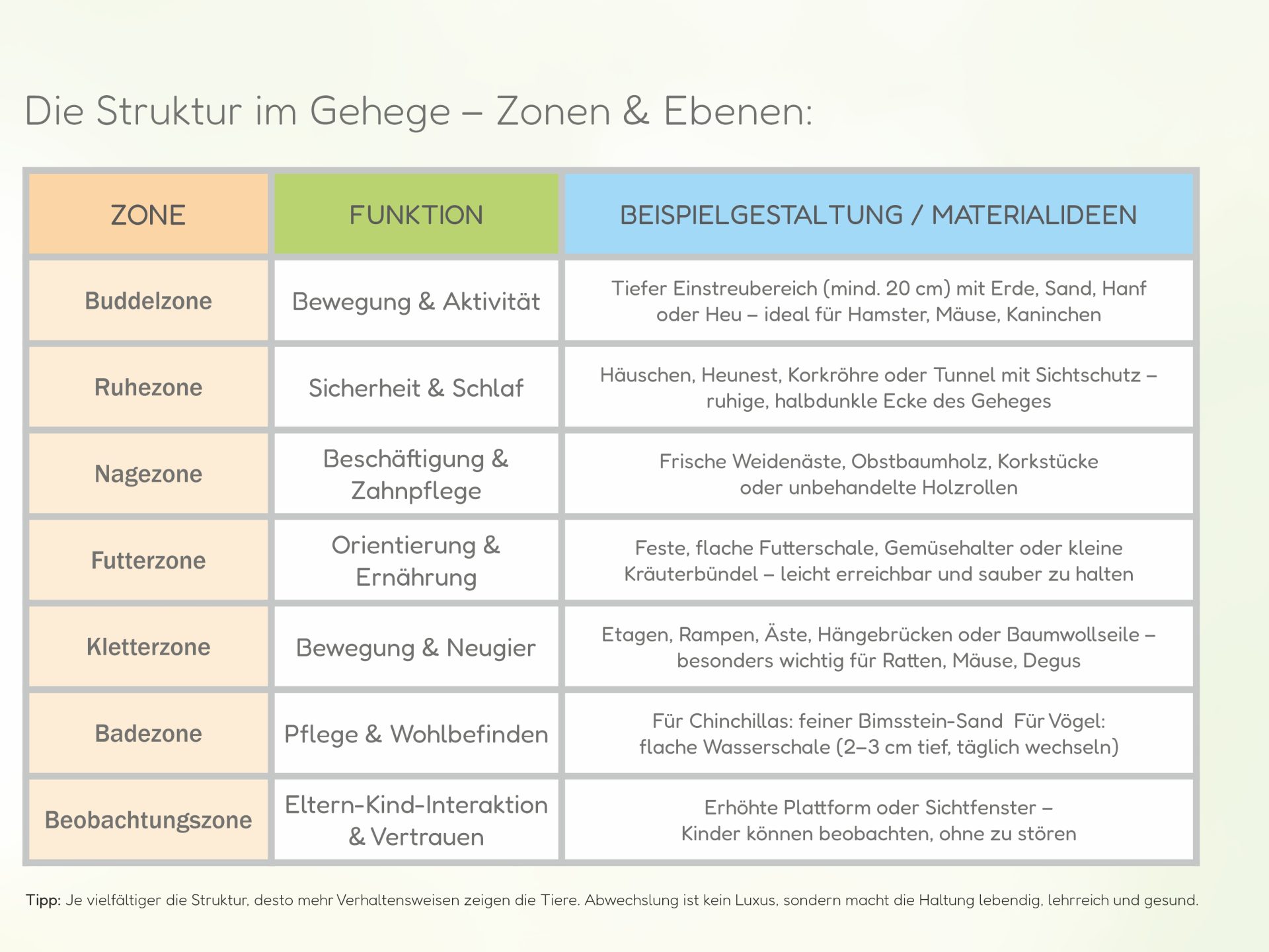 • Spezialzonen: Buddelkisten mit Erde oder Sand, Nagematerial aus Weide oder Kork, Badezonen (trocken oder nass), Bewegungs- und Kletterzonen, Rückzugs- und Ruhezonen, Futter- und Vorratszonen, Beobachtungs- und Aktivitätszonen