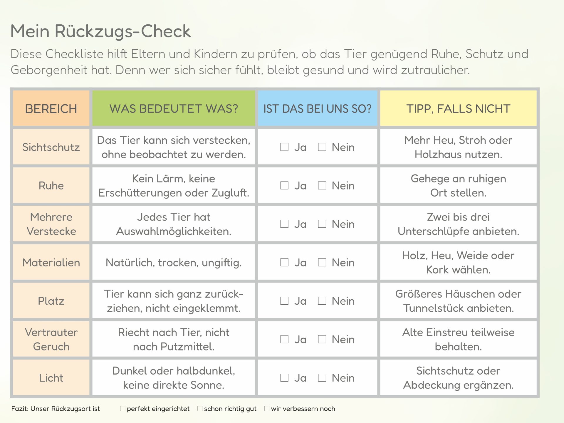Diese Checkliste hilft Eltern und Kindern zu prüfen, ob das Tier genügend Ruhe, Schutz und Geborgenheit hat. Denn wer sich sicher fühlt, bleibt gesund und wird zutraulicher.