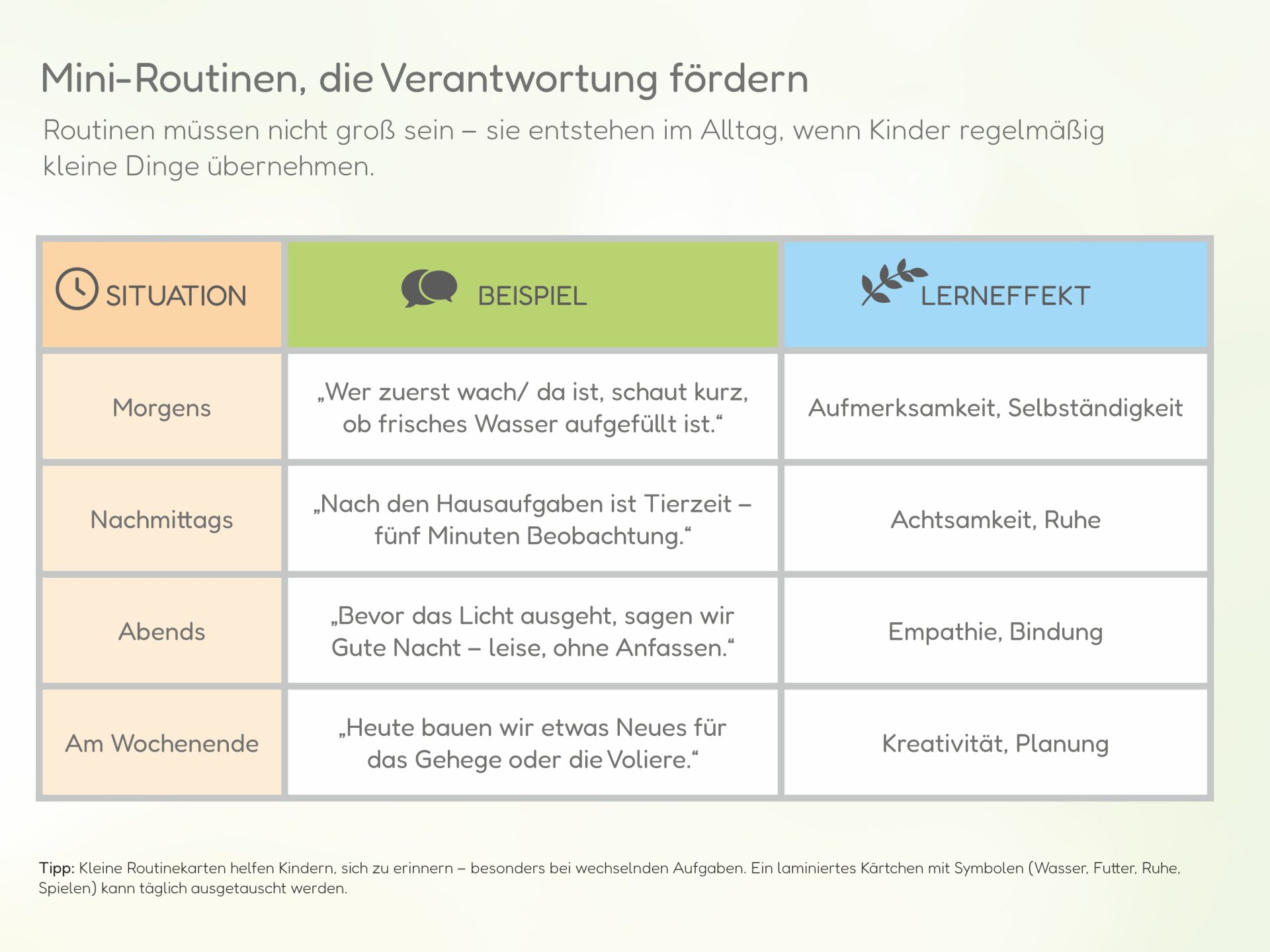 - „Tierzeit“ täglich zur gleichen Uhrzeit einplanen (auch 5 Minuten reichen).