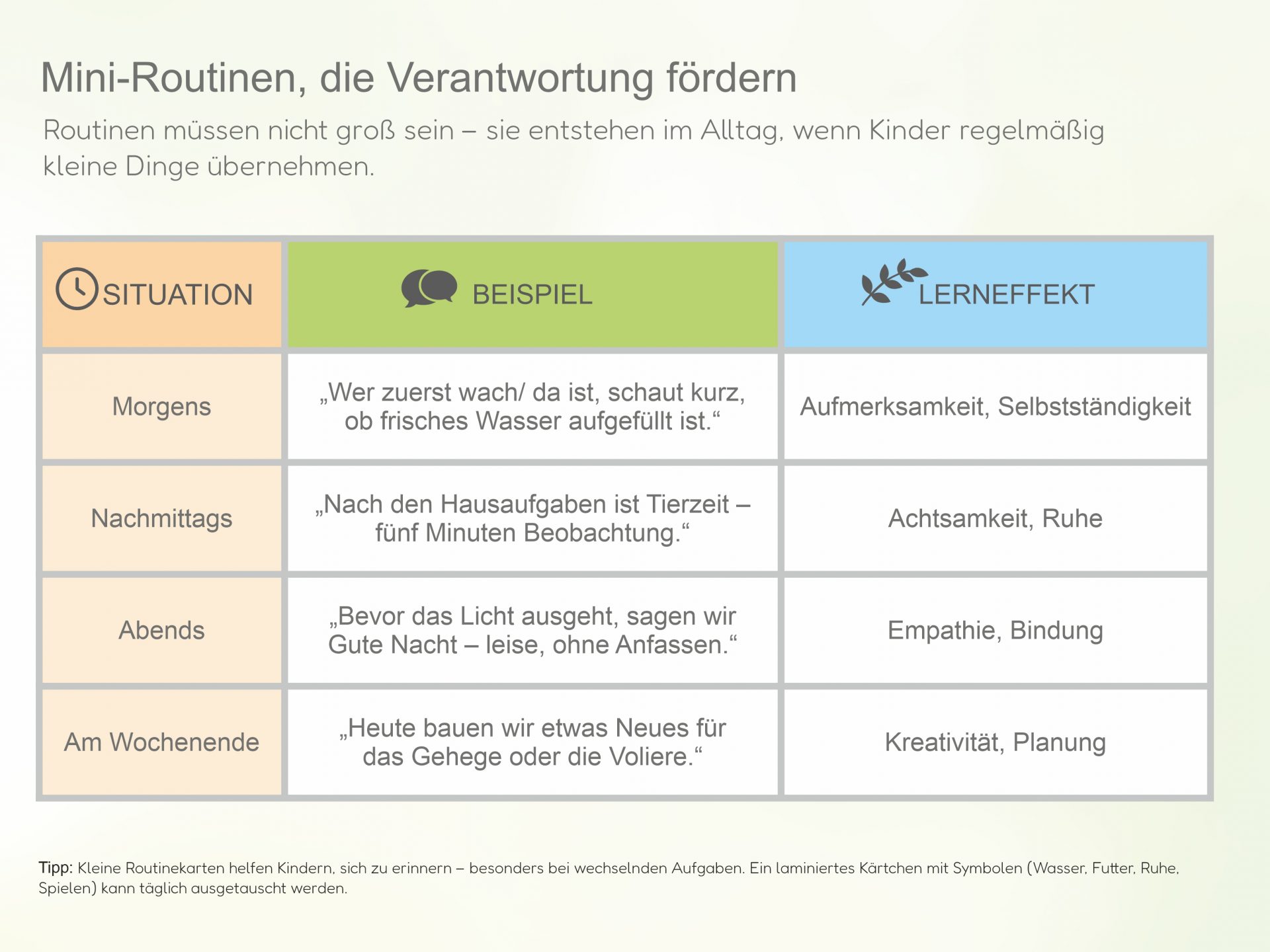 - „Tierzeit“ täglich zur gleichen Uhrzeit einplanen (auch 5 Minuten reichen).