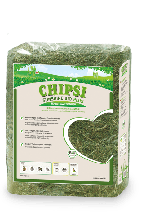 CHIPSI SUNSHINE BIO PLUS ist ein hochwertiges Bio-Bergwiesenheu aus kontrolliert ökologischem Anbau. Die Pflanzen stammen von artenreichen Bergwiesen und werden schonend in der Sonne getrocknet – ganz ohne chemische Zusätze. Mit seinem hohen Rohfasergehalt unterstützt es die Verdauung, fördert die Darmflora und sorgt für gesunden Zahnabrieb.